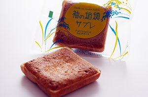 袖ケ浦産の米粉と金ごまを使い、サクサクと香ばしく焼き上げたサブレと最中皮のハーモニー。