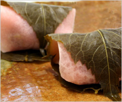 桜の葉は、静岡県西伊豆産の日本のものを使用しております。皮の美味しさも是非味わっていただきたいです。